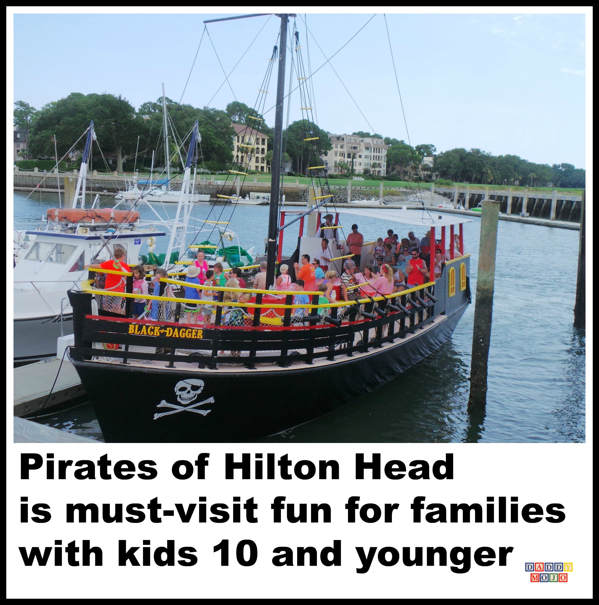 Once you arrive at Harbor Town just walk down to the marina and find The Black Dagger. It’s a large black ship with red and yellow accents and flying the Jolly Roger flag. It is a real pirate ship and the experience that you’re about to go on will enthrall children 10 and younger.