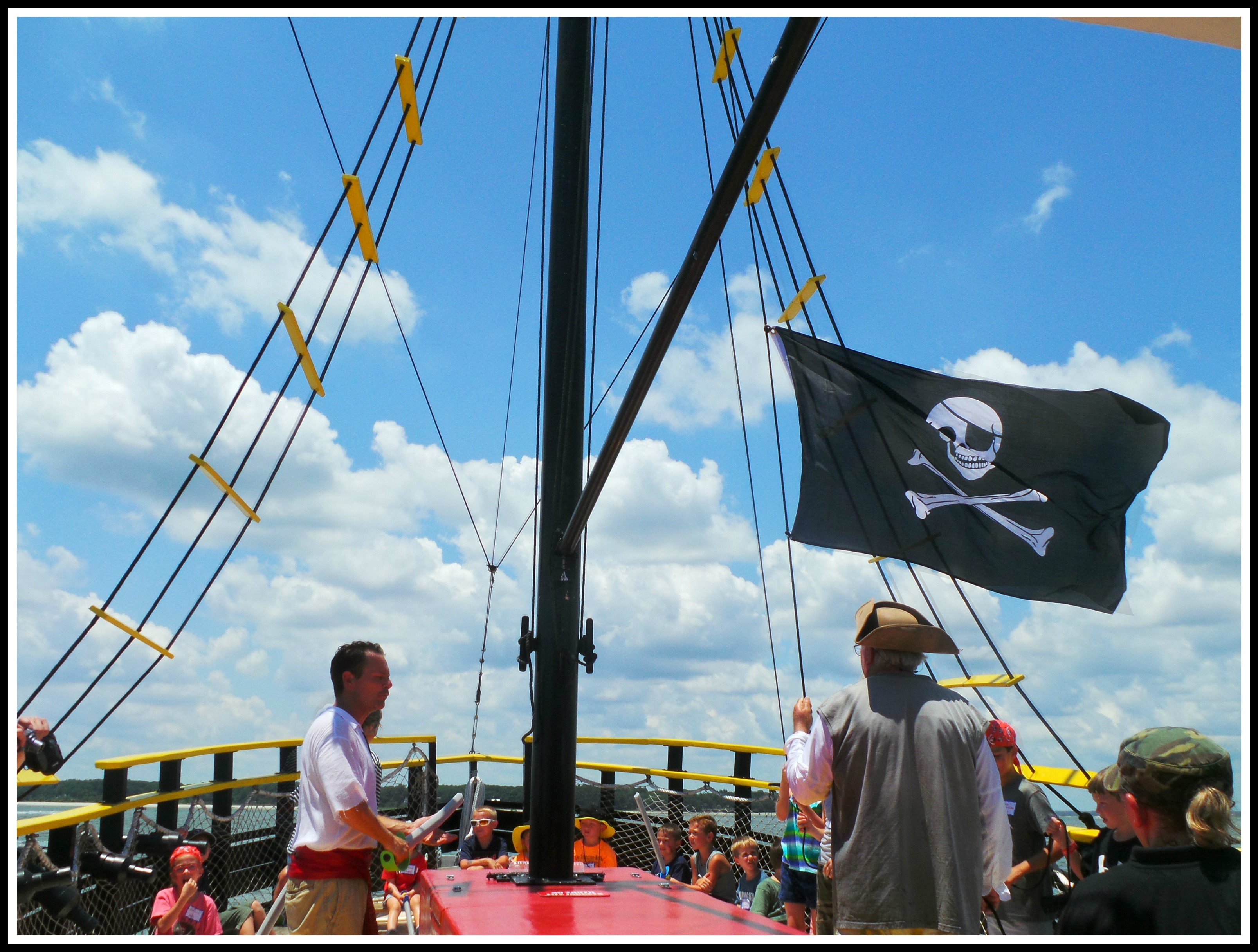 The show is driven by two first mates who alternate between pumping up the crowd on the starboard and port side. As the ship makes its way out into the Calibogue Sound they make lots of pirate jokes, introduce you to the captain, get to know the kids, sing songs and did a variety of skits. But this is no variety show, you’re on a search for treasure that’s been marked by floating buoys that can be seen on the water. You also want to get the treasure before the smelly, villainous Stinky Pete finds it.