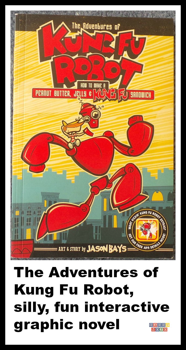 The Adventures of Kung Fu Robot is the online comic and game that your kids (or you….) might have been playing. From the retro feel to its manic action it was only natural that it make the transition to graphic novel. The Adventures of Kung Fu Robot, How To Make A Peanut Butter, Jelly & Kung Fu Sandwich is out, and it’s out with a twist. It’s from AMP! Comics for kids and retains the bright colors and style that fans who loved the online comic, but it also has interactive elements to wow the crowd who are coming at it from a book perspective.