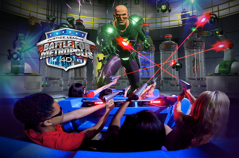 Justice League: Battle For Metropolis just opened at Six Flags Over Georgia. It’s a 4D interactive attraction that takes riders through Metropolis as its under siege from a litany of villains in the DC Universe. The ride was names one of the Top Ten New Amusement Park Attractions by USA Today and was awarded the Brass Ring for “Best New Product In The World” by international Association of Amusement Parks. That’s a whole bunch of accolades, but is Justice League: Battle For Metropolis a fun ride for the family?