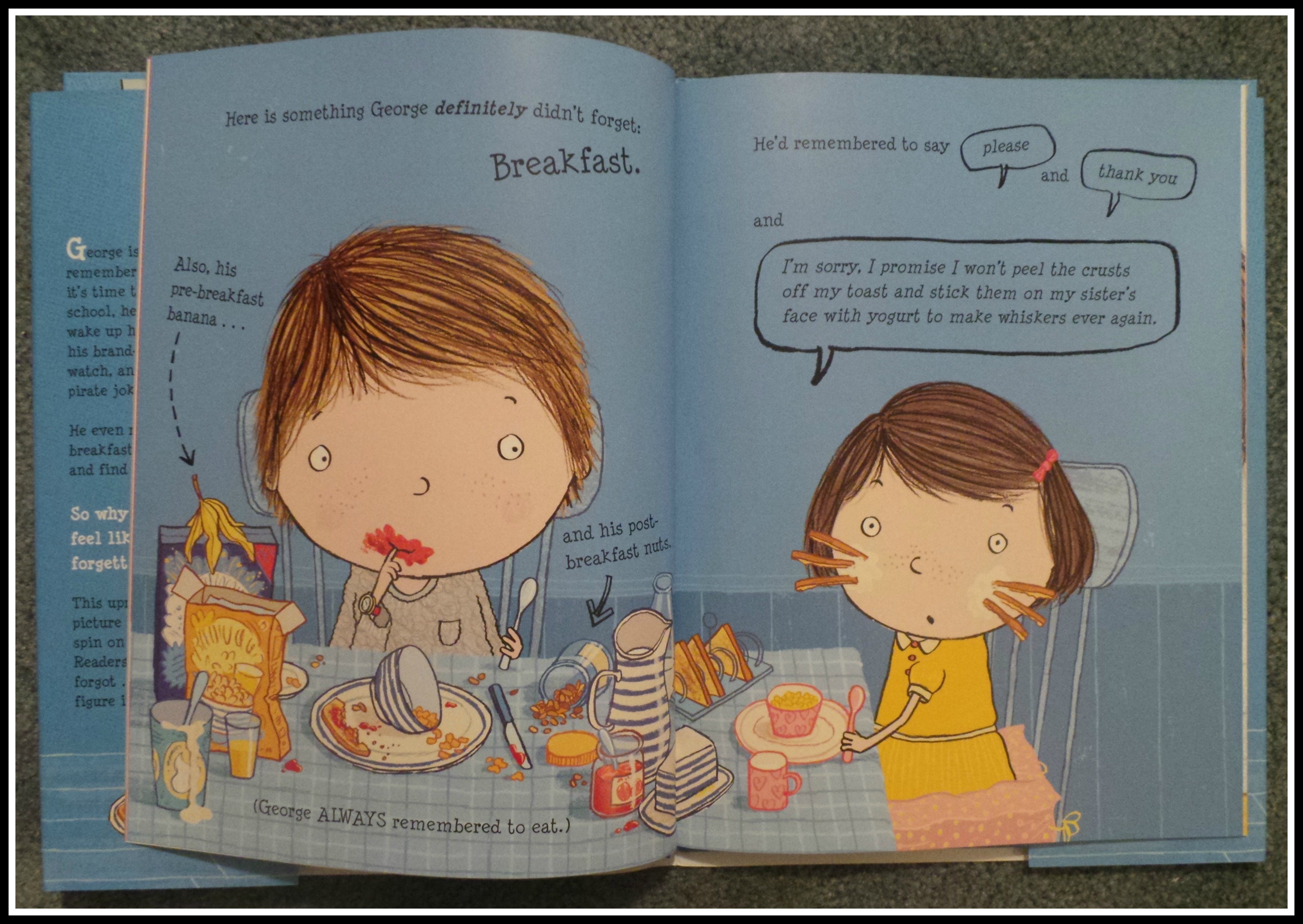 What George Forgot is the story of a young boy (about 5 years old) who wakes up in the morning and is convinced that he forgot something, but can’t figure out what it could be. He goes through all of the basic things like waking up mom with a running bear hug, tickling dad’s feet, eating breakfast and brushing his teeth. But it’s almost time to catch the bus for school and George still is thinking that he’s forgotten something.