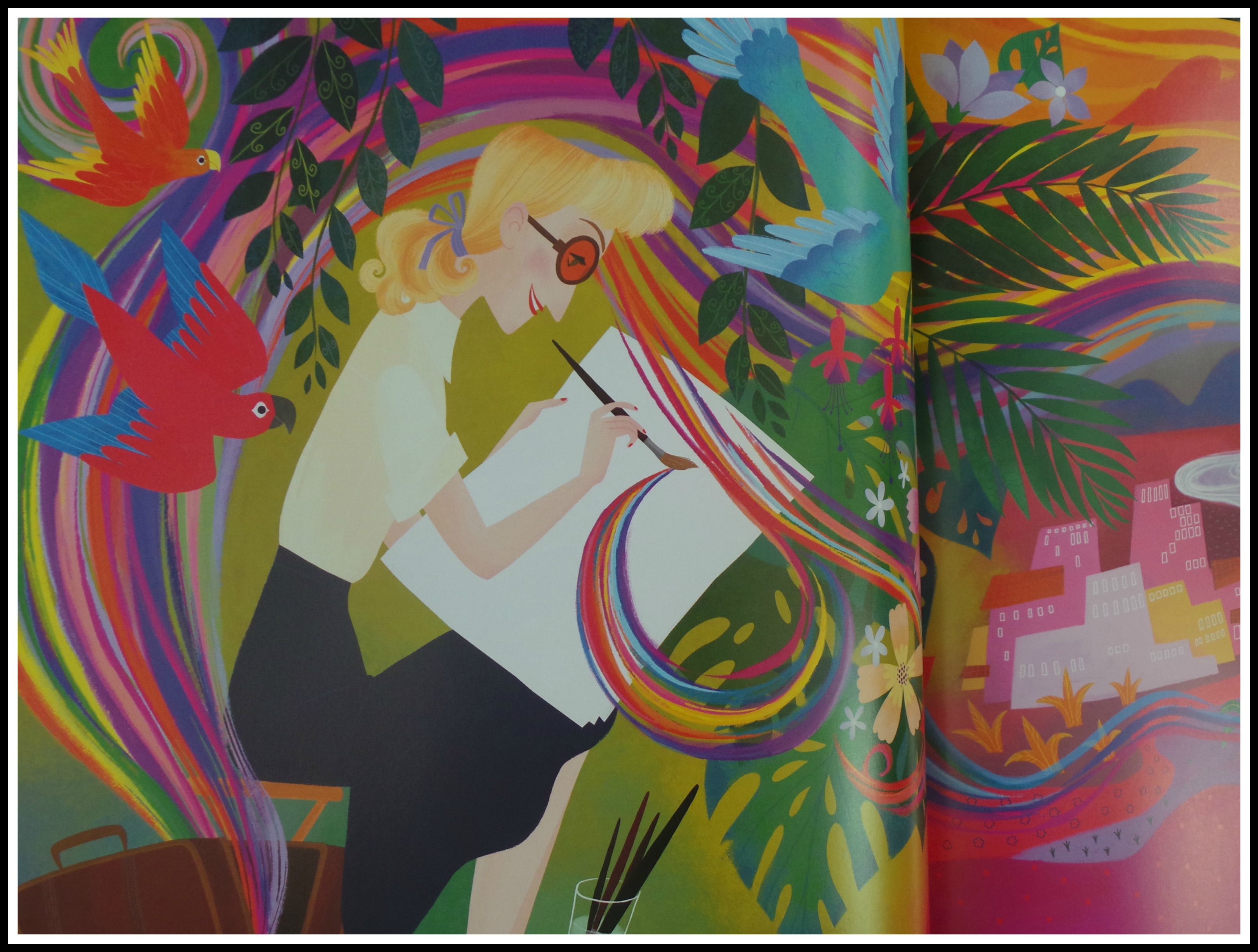 Pocket Full of Colors has a couple things going for it even before you open it. It is huge. It’s a standard, rectangular, almost square book that you’ve seen other children’s books, but this is different level big. If there was a category or coffee table children’s book then this would be front and center. The subtitle of the book, The Magical World of Mary Blair, Disney Artist Extraordinaire lets readers know that she’s an artist that used to work for Disney. The cover is a cornucopia of bright, magical things like castles, mermaids, animals and other brightly colored art deco things that are all coming from an artist’s work as she diligently sits there painting.