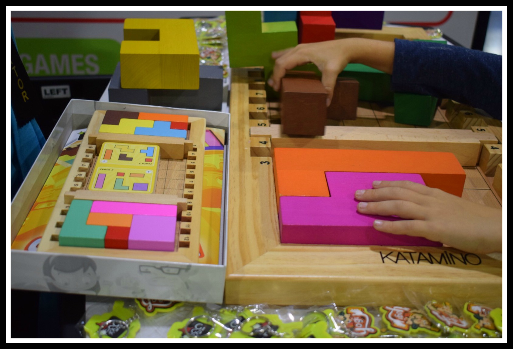 He found the Gigamic table and was attracted to it like a moth to a flame. On the main table was their most popular and best-selling game Katamino. Essentially this is a 3-D table version of a flexible Rubik’s Cube. The version that people can purchase is the version on the left. The large version on the right is the one that is taken out for demonstration purposes.
