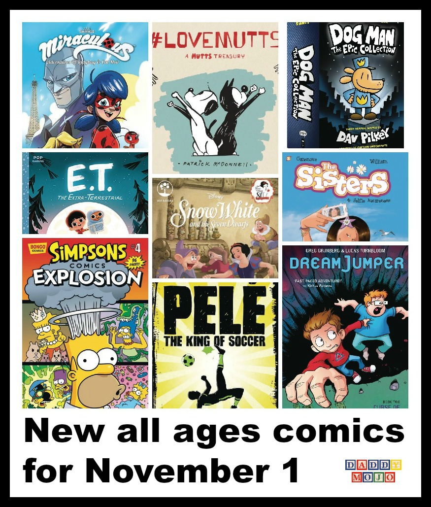 What are the new all ages comics this week? It’s a great week for some all age graphic novels including the sequel to one of our favorites from last year, Dream Jumper. Dream Jumper, Curse of the Harvester continues the story of Ben, who is now in the business of dream jumping and business is booming; but a new force in the dream world is about to cause chaos. Dream Jumper is a great graphic novel series from Graphix for ages 7 and up. Also in the podcast we’ll talk about Snow White, a new Mutts Treasure called #LoveMutts, Dog Man and more. Here’s a look at five new all ages comics that you’ll want to pay attention that are in stores.