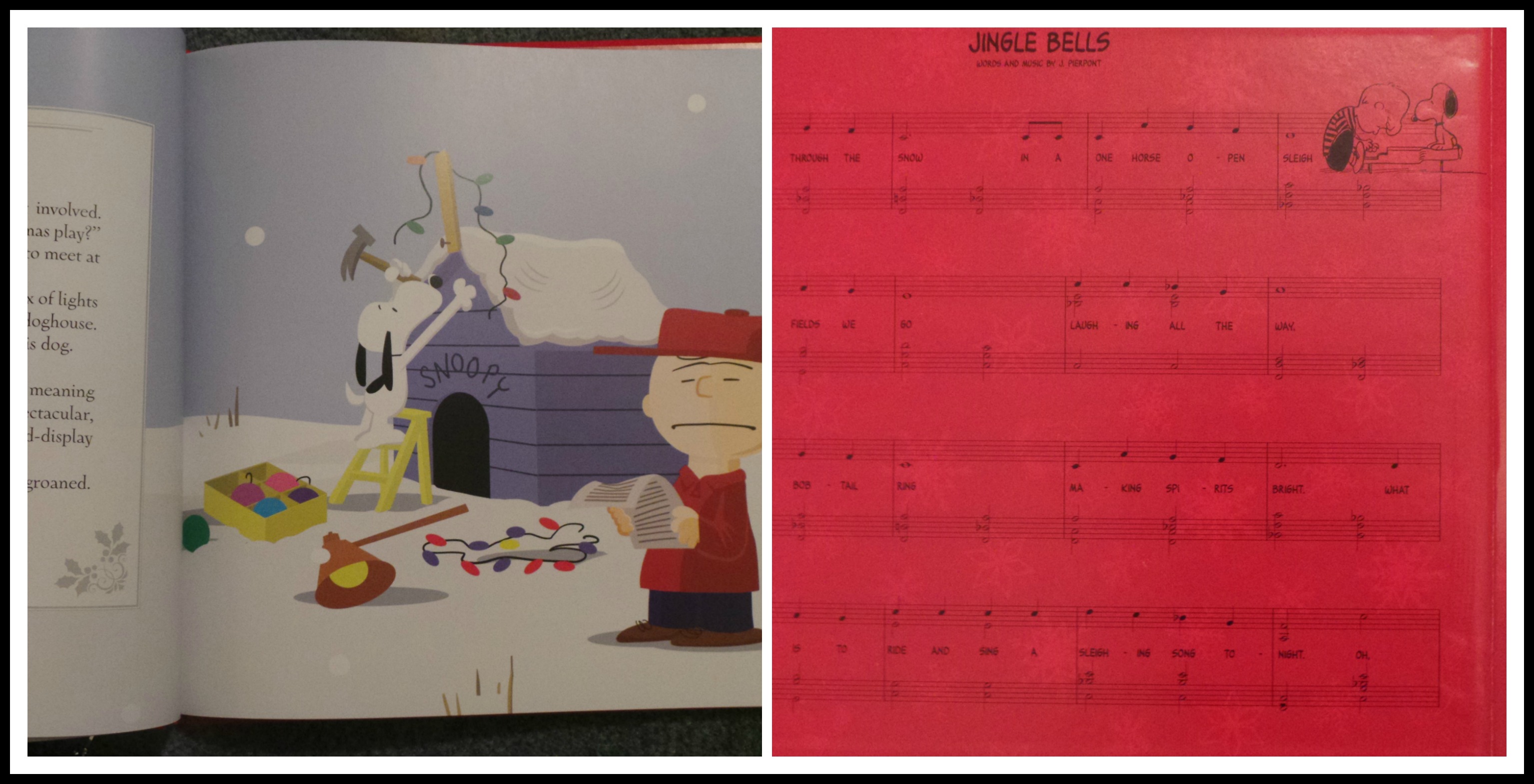 The interior covers have sheet music printed on them with Jingle Bells in the front and Hark! The Herald Angels Sing on the back.