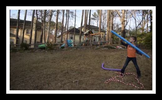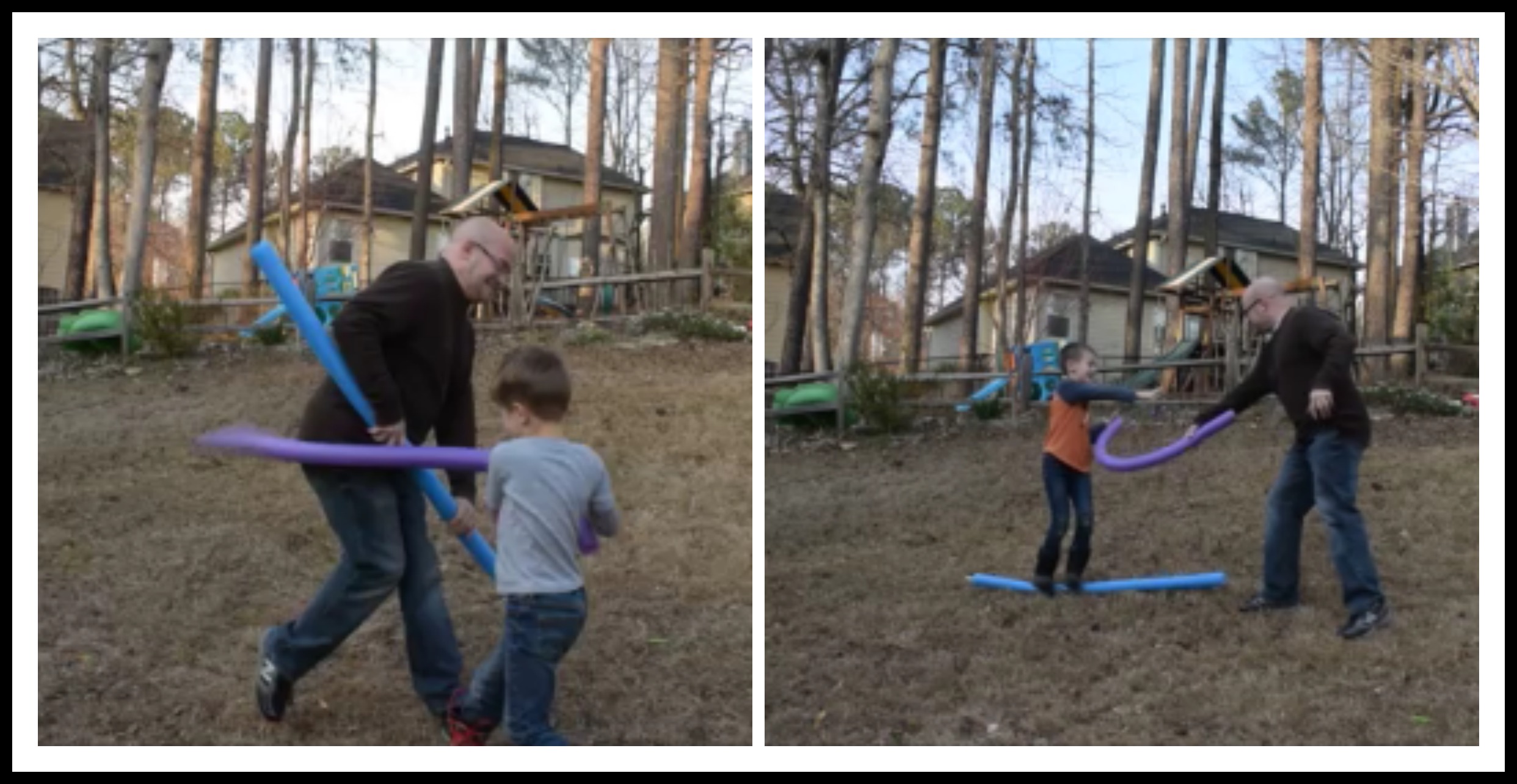 If the kids are slightly older you can put something inside the pool noodle that will make is stiff, thus being able to be thrown for either distance or target practice. In our case we use some quarter round molding, this let our 8 year old throw it to where it would actually go ten yards or longer with practice. However, when you put something in the pool noodle it’s hard and could easily be used as more of a sword, than a javelin. If you use the pool noodle in this way for this game it’s important to know your audience. A group of 8 year old boys wouldn’t be good for this unless they were supervised.