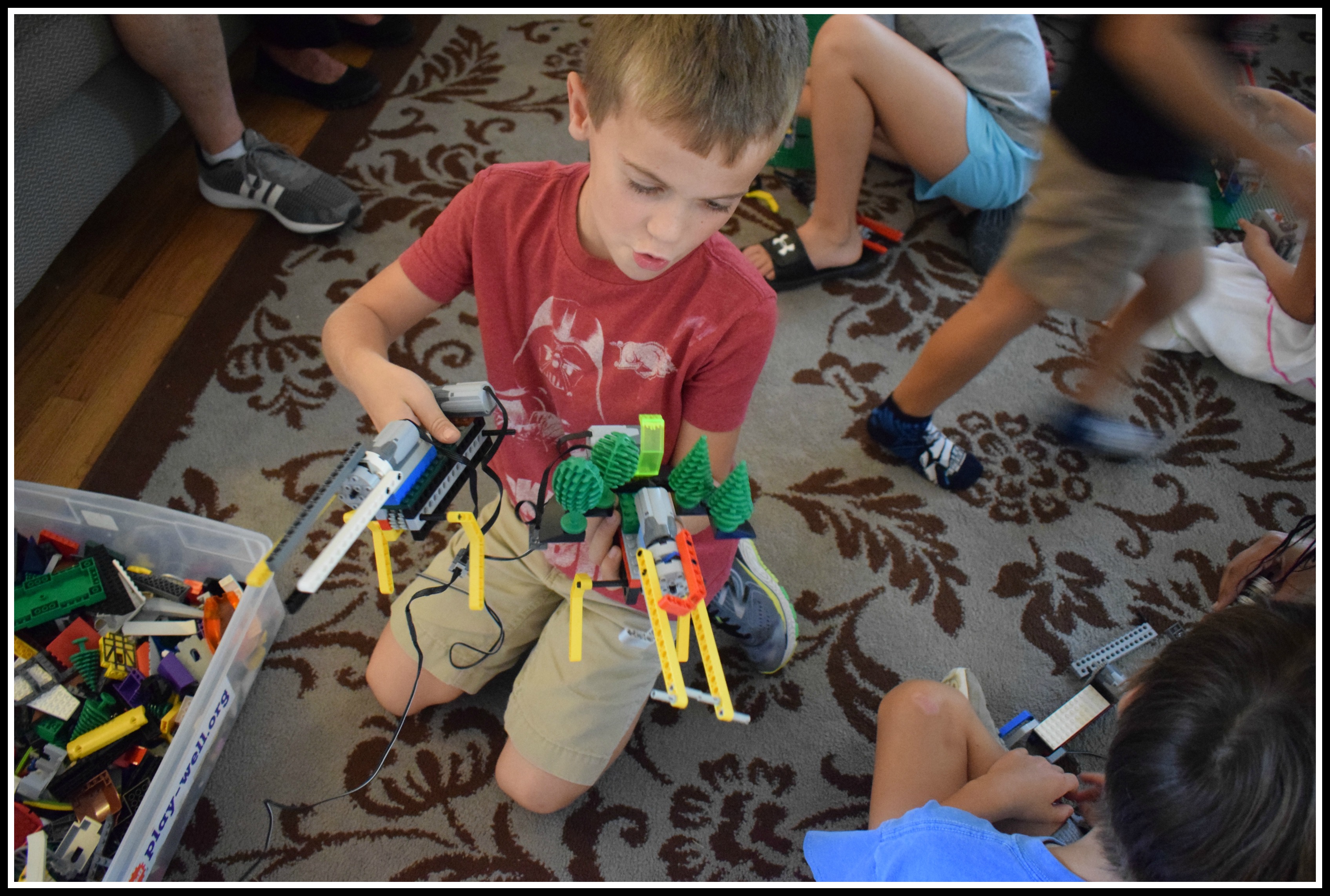 As a parent who loves LEGO and whose children love LEGO we were full of questions. Let’s get the low hanging LEGO fruit out of the way and say that, just like the Play-Well LEGO Camps, you do not get to keep your creations. Our house had thousands of LEGO pieces brought in by the play coordinators and there wasn’t a single brick left by them when the party ended. That was a testament to how well they organized the different bricks, motors and pulleys, as well as, how engaging they were in dealing with a pack of 15 eight year old kids.