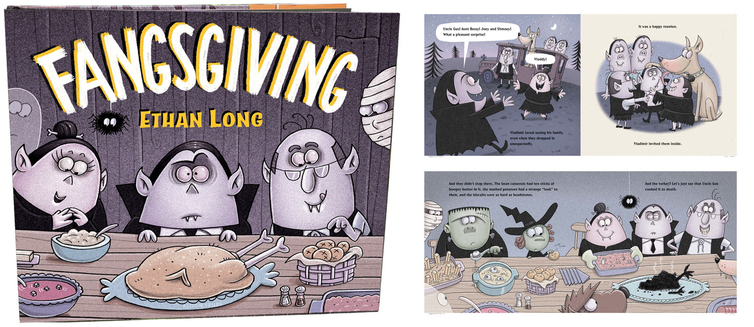 Ethan Long is onto something. We were fans of Fright Club. We enjoyed Valensteins even more and with Fangsgiving it’s like we’re welcoming a friend back into the fold again. The titular character, Vlad is back with his monster friends for Thanksgiving. They’re happily planning a low key Thanksgiving when his family unexpectedly pulls up. The chaos and frustration that ensue at Vlad’s house is akin to the stories and feelings that you probably associate to your Thanksgivings as well.