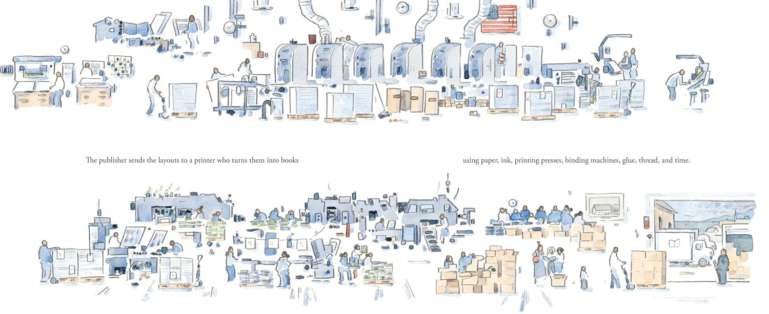 When the work is done she pedals into the city to drop off her manuscript at the publisher’s office. They do their organizational work, ship it to the printer where the physical process of putting it together happens. Once the book is made it’s put into trucks, shipped across various landscapes and ending up in stores, schools and libraries. It’s here that kids will pick up the book and take it home to their families. The youth will relax with the book up in their room, where they’ll start their own physical creation.