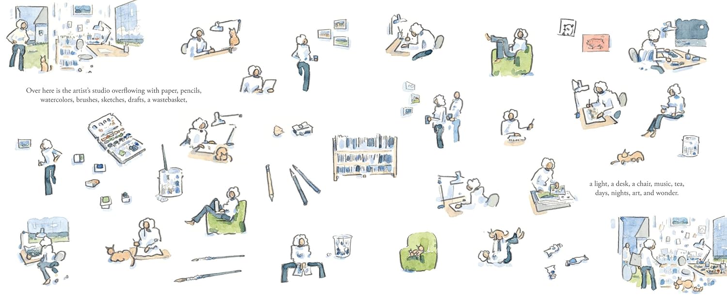 Those young ages don’t know lush as an adjective yet, however, it’s the perfect way to describe Here is a Book. The first two pages have our author sitting by the ocean, jotting ideas down in her notebook. They’re swirling into the pages without any rhyme or reason, trees, various farm animals and some of the products that you’d see in that area. The blurbs that show the author gradually get bigger, with text fragments laying down a metaphor between her garden and her work. Inside her studio the mandatory items like her pencils, erasers, late nights at work, work cats, crumpled drawings and more are shown.