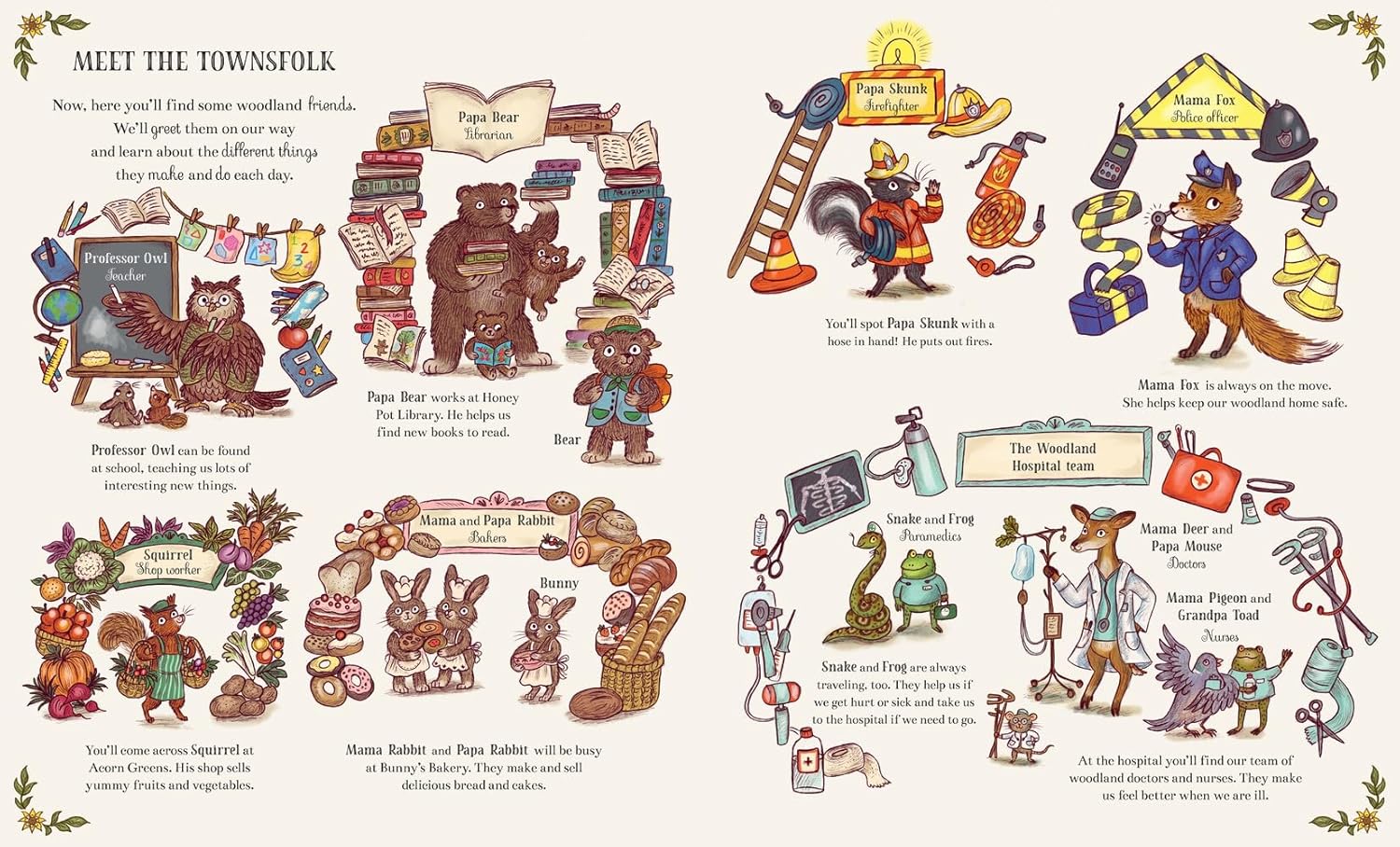 The Brown Bear Wood book series probably has the same cast of animal characters in each of the books. It’s Busy Down in the Woods Today starts with readers being introduced to all of the people who work in the woodlands. Think of the top ten jobs a pre-k kid knows and they’re in there. We see Mama Deer and Papa Mouse who are the doctors, the squirrel who is the shop keeper and a couple of others.