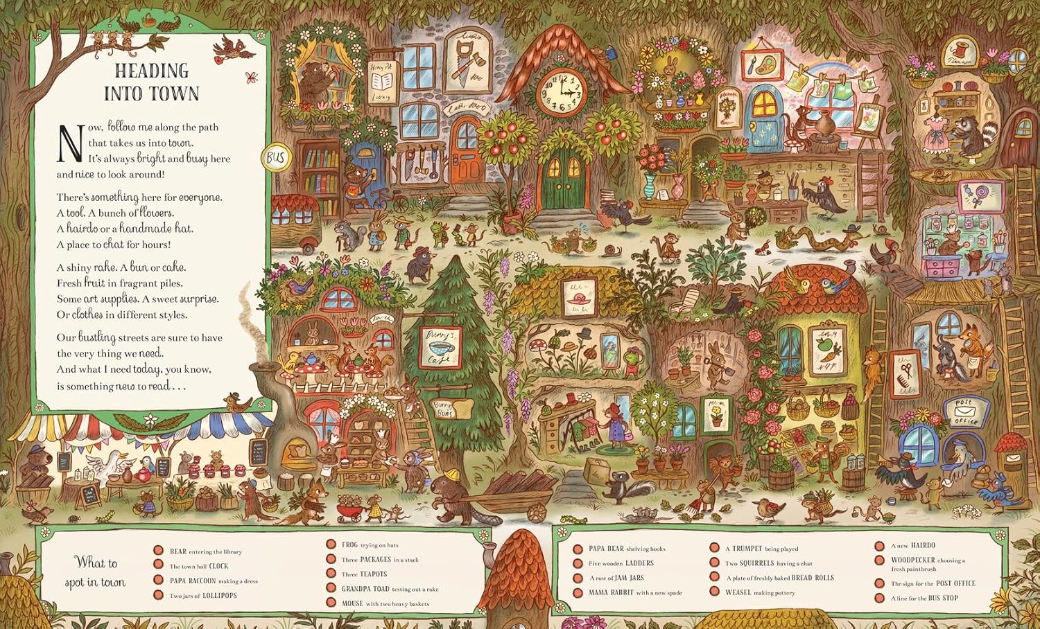 It’s Busy Down in the Woods Today is the literary cousin of Waldo. Instead of asking where he is or why a skinny beatnik kid is so hard to find, let’s draw a magical, woodsy scene. It’ll be inhabited by multiple dozens of anthropomorphic animals who are going about their day. Some of the pages are more lyrical. They’ll have a series of poems set against close-up illustrations. You’ll see the village’s inhabitants at the bakery, library, and hospital or participating in the town’s day of help.
