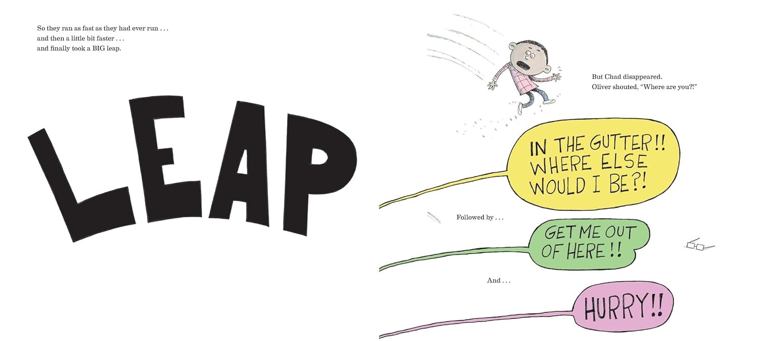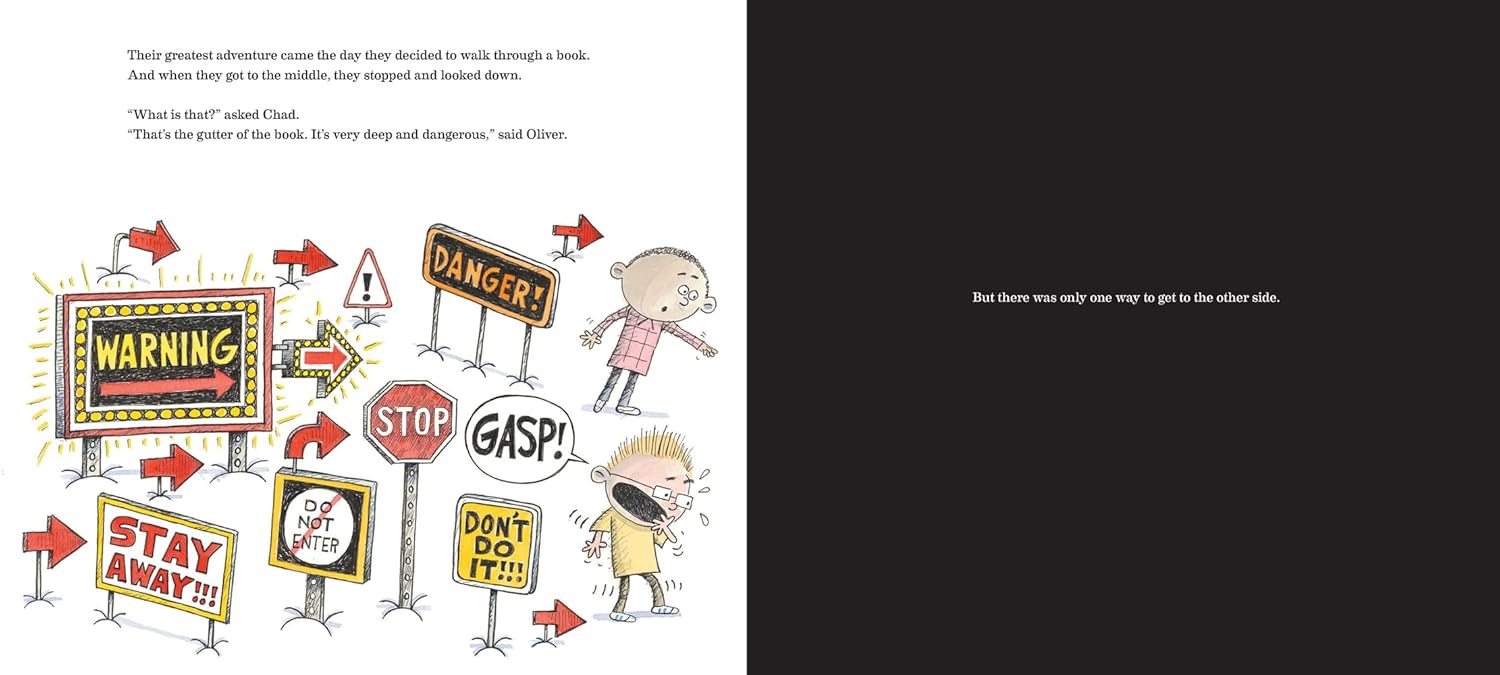 It’s a silly book that brims with cartoon energy reminiscent of The Monster at the End of This Book. Lost in a Book follows the adventure of two friends. Chad and Oliver see all sorts of warning signs as the two approach the gutter of the book. The gutter is that space where two pages join in a deep crevice sealed by the book’s spine. The two are out for an adventure and the only way to get to the other side is to cross the gutter. They get a running start and take a huge leap, but Chad doesn’t make it and gets stuck in the gutter. His glasses are on the ground near Oliver, with his calls for help coming out in speech bubbles from that area you previously didn’t know even had a name.