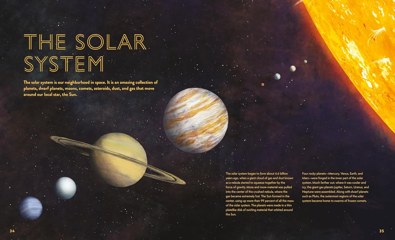 Our Cosmos has text that speaks to kids in a common sense manner that allows them to understand it, while allowing their imagination to do some exercise too. When the book starts, it explains, in kid-friendly text, why light-years are used to measure distances in space. When it comes to celestial facts, that aspect of space, distance and time still fascinates me. Light travels 186,400 miles in one second in an empty space. When I was a kid I struggled trying to rectify that six-digit number with the fact that my idiot buddy and the light switch. They could flick the switch and I could run a fraction of the way across the room before the room went from dark to light. This fact meant that I could run almost as fast as the speed of light, which meant that I was almost as fast as The Flash, which meant that I was almost a superhero and didn’t have to do my homework.