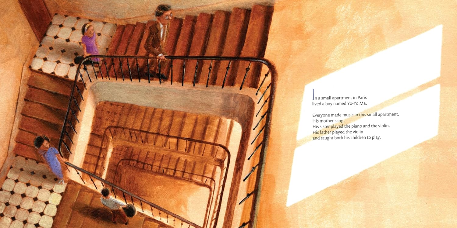For adults, the key to the book is its title. The Music Inside Us is as much about the ‘us’, or people reading the book, as it is about the most famous cellist in the world. The book does follow Yo-Yo Ma’s life. He spent his early childhood in Paris, practicing with his sister Yeou-Cheng when he was four and she was nine. She played the violin and the piano, his father played the violin, his mother sang, but he wanted to play something large.