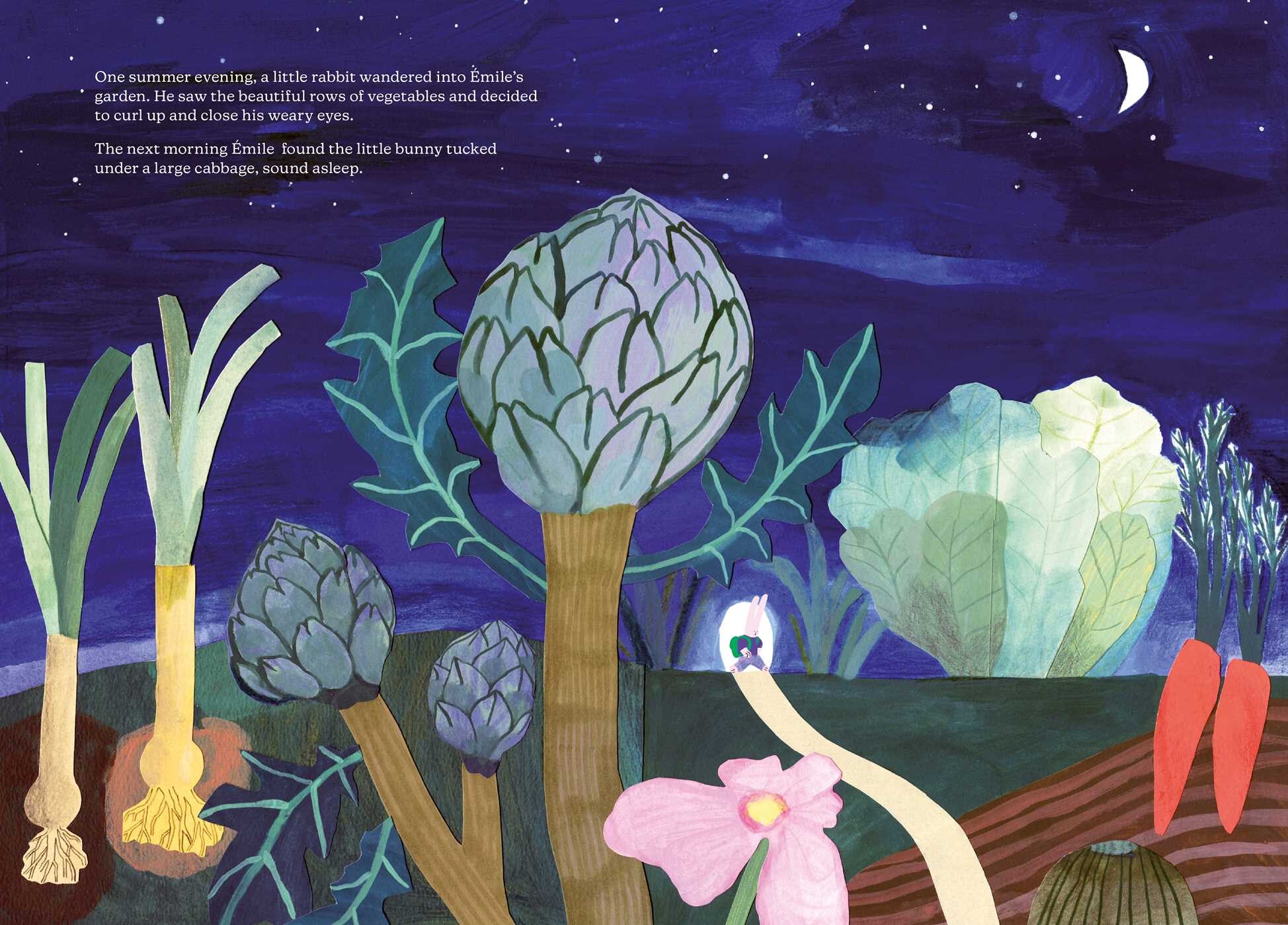 Dang, that’s a tall order, and you just wanted a children’s illustrated book to be a children’s illustrated book. The pages in A Home for Felix don’t waste any space in its four corners. It tells a big story in a short amount of time. Emile is a rabbit who lives a simple life in the country. He’s got crops that he tends to and is quite content in its simplicity. One day another younger rabbit wanders onto his farm and falls asleep under a large cabbage.