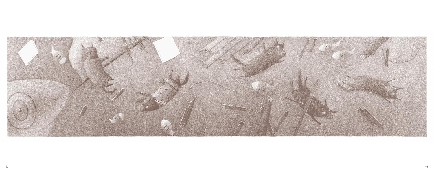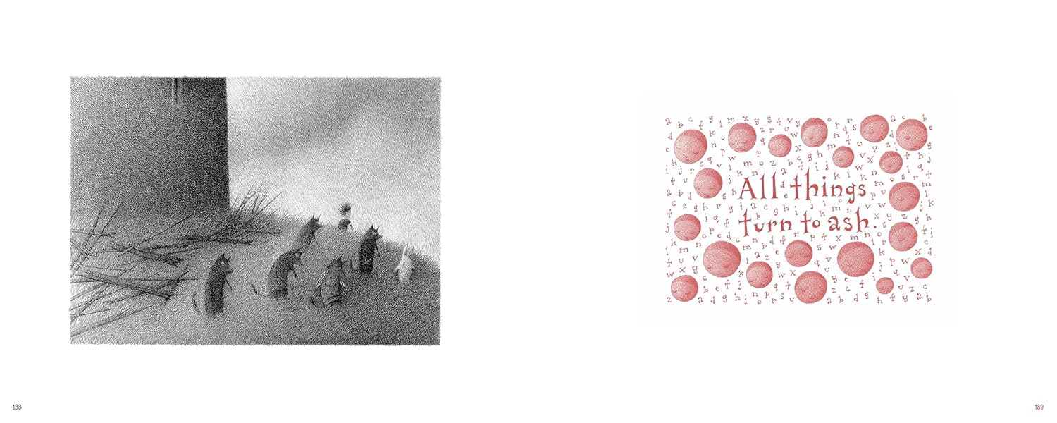 The Five Wolves is a challenging book to describe. At times, it will remind older readers of Pink Floyd’s The Wall. There are many of the illustrations that brought back Monty Python allusions. Kids who recently read Where the Wild Things Are will comment that The Five Wolves looks familiar to them. This book is all of that and nothing. It’s its own story, but is a grand allegory for life’s creative nature. This is a book whose plot is about the nexus of life and art and the degrees to which they intertwine with one another.