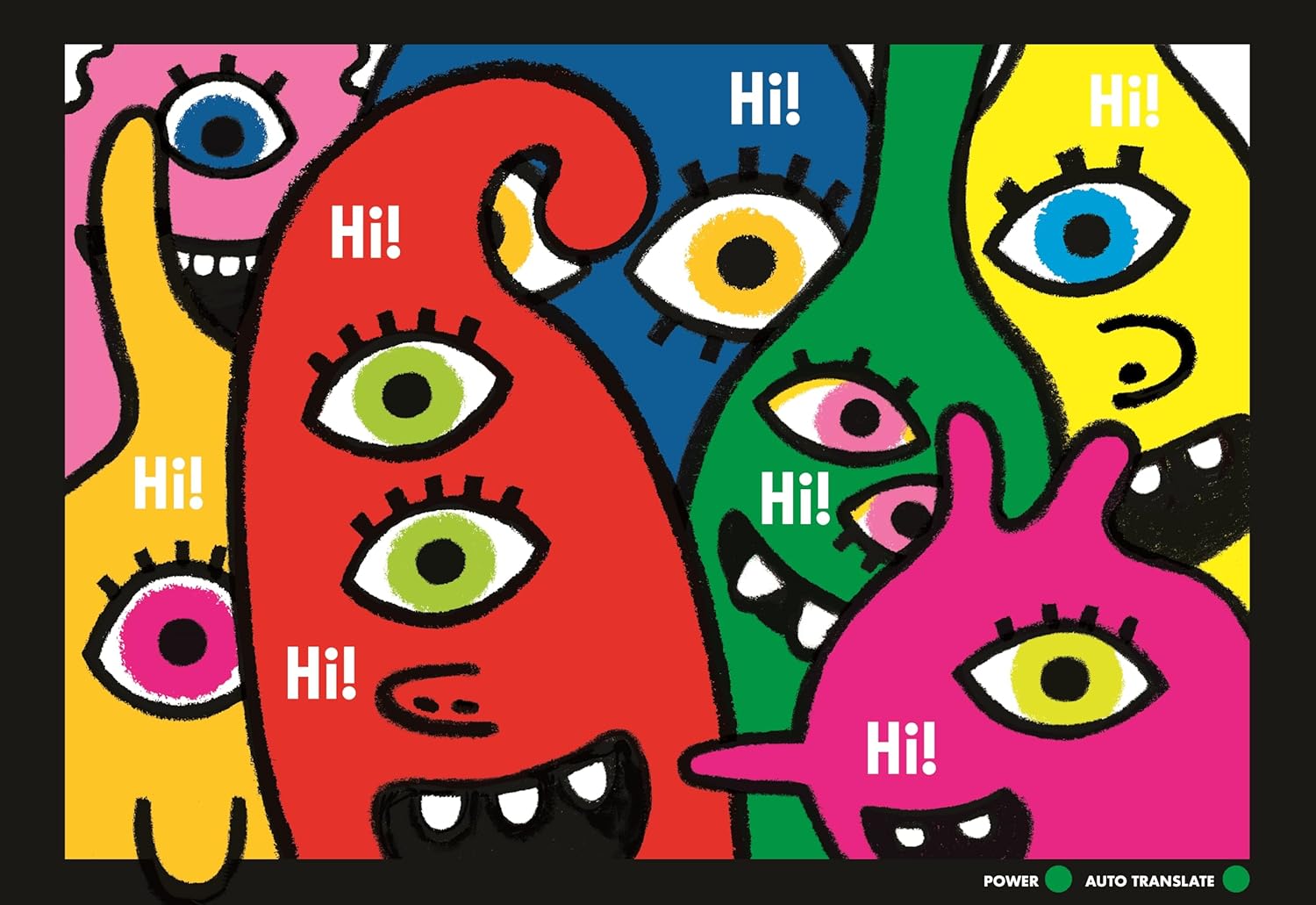 The green power indicator, in the lower right corner of the pages, is going yellow. The window is getting smaller. The power indicator is red now and the transmission window is as small as it was when the book started. The aliens have just enough time to send a message to “all the planeturthlings”. It’s a nonsense series of letters that we can’t understand, but the transmission window shows a red outline of a heart. When the power completely shuts off, the power and auto translate button turn red, and any sign of the window has been replaced by solid black pages.