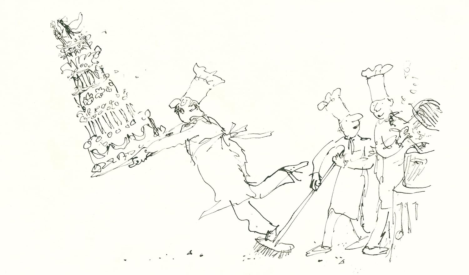 Readers of all ages will recognize his style from any of the 18 Roald Dahl books that he’s illustrated. Those book covers, when looking at the bigger picture of his creativity, acted as a regulator on his vision in two ways. In Fantastic Journeys the pages are physically larger, which gives his 2d drawings more space to move. His illustrations show chefs tripping with six-layer cakes, a beach house with a helicopter blade on its roof, hovering over the ocean with people diving into the water and others climbing up the ladder, naturalists drawing animals and other seemingly disparate topics.